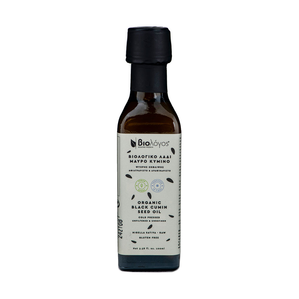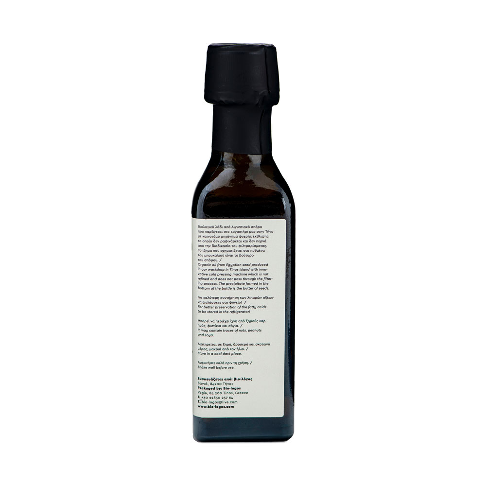 Powerful organic oil Black cumin Nigella Sativa produced in the laboratory in Tinos with an innovative cold-pressed machine which is not refined and does not go through the filtering process.